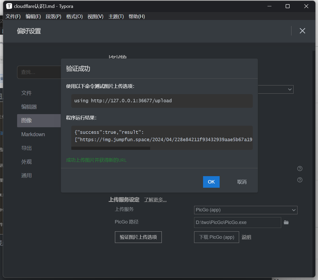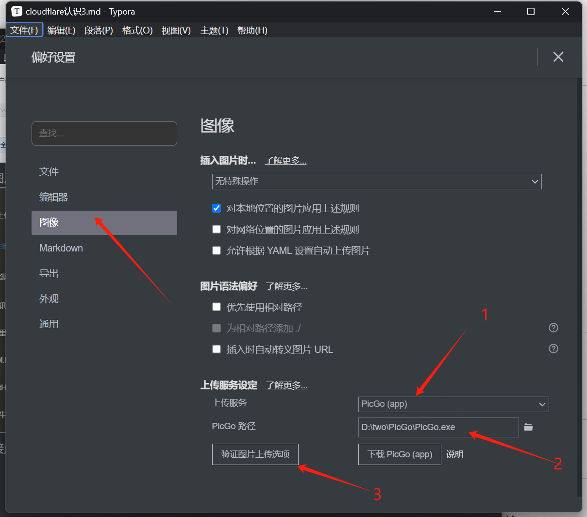 在上一篇cloudflare认识2(picgo结合使用) 把picgo成功结合CF实现了图床功能后,为了后期用Typora写md方便,这回直接在Typora里面配置了picgo用来直接上传到CF上,具体操作如下