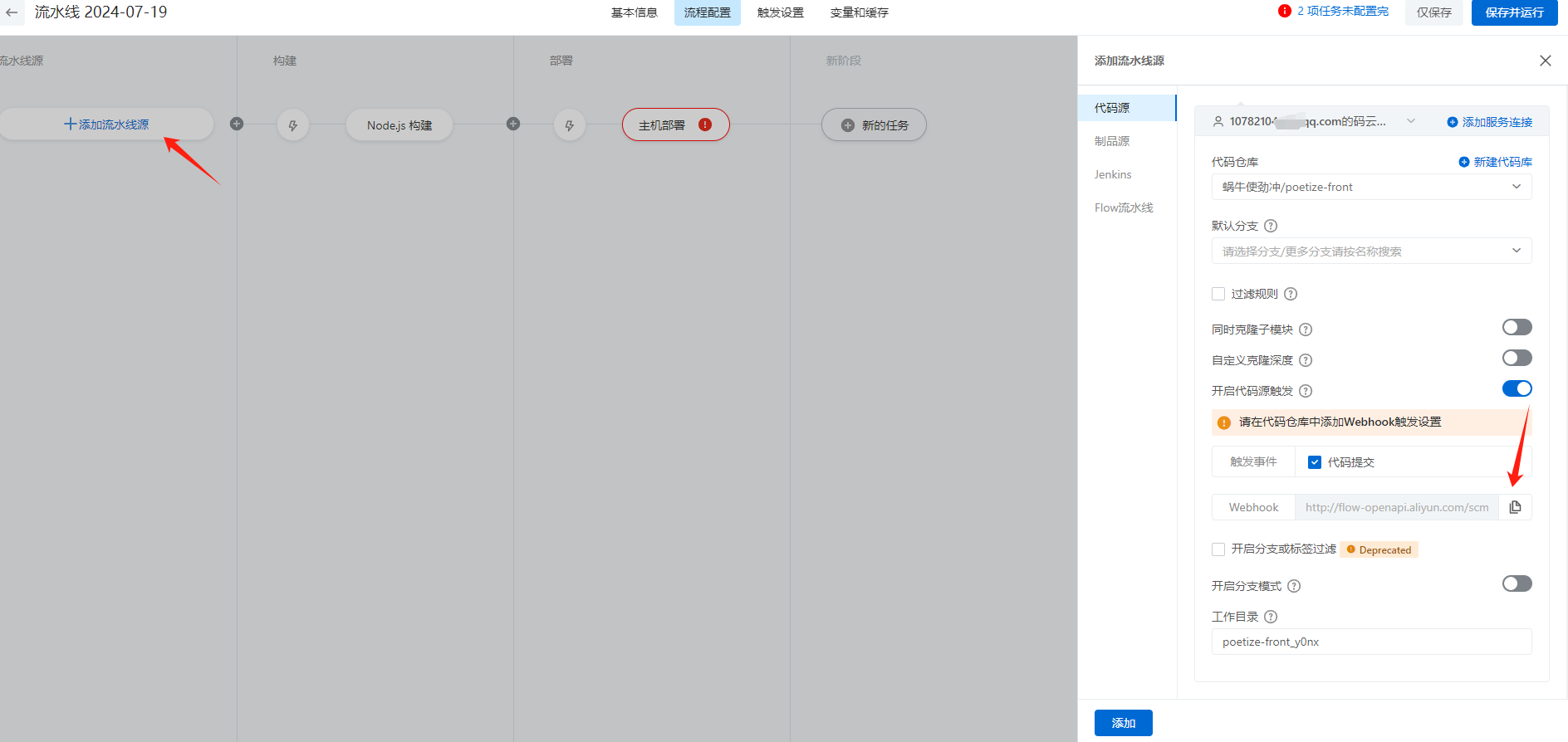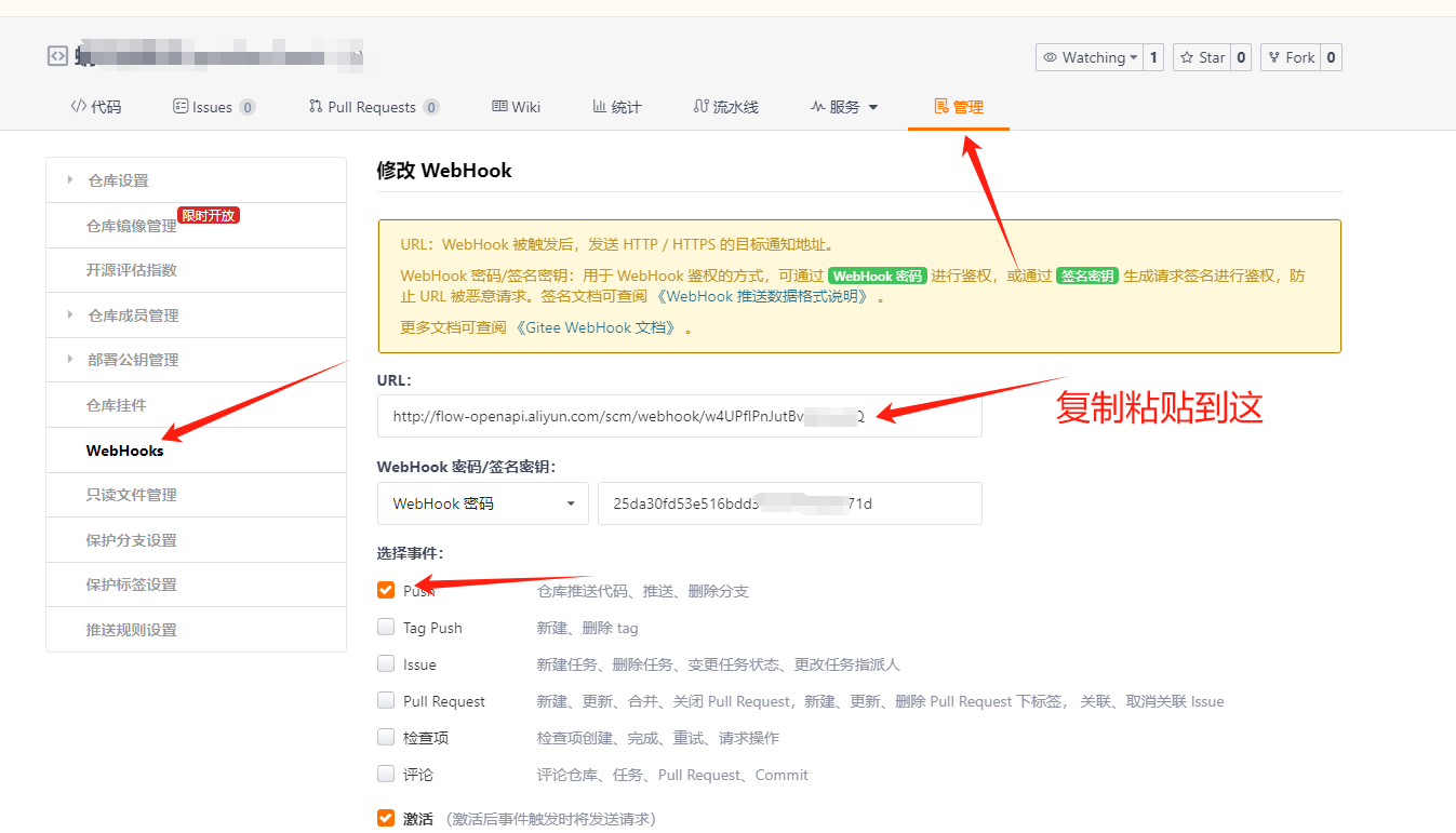 BlogPost5 min read阿里云效钩子设置Written on 2024.07.19概要 这里是记录云效的钩子设置 流程 进入配置仓库源,然后复制Webhook的地址 这边以gitee为例,配置成这样 小结 简单记录下,留后期回顾。
