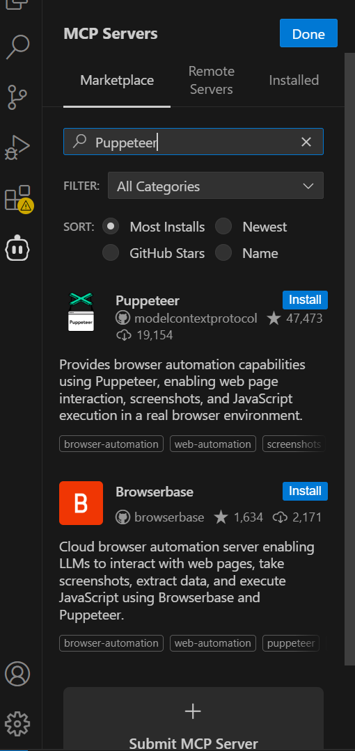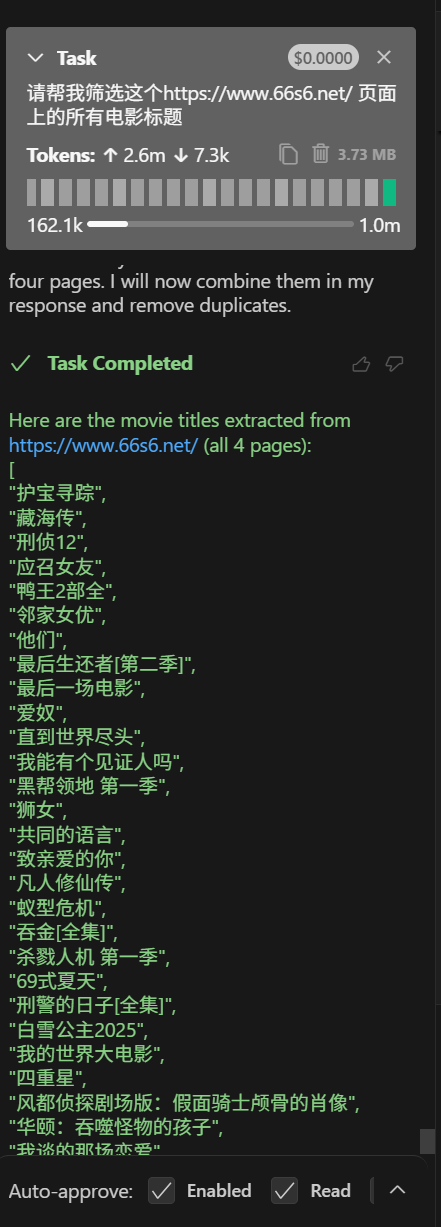 技术方案背景:使用vscode的cline然后在Mcp商城下载使用Puppetteer,我这边是想收集网站上首页那几页所有的电影名称