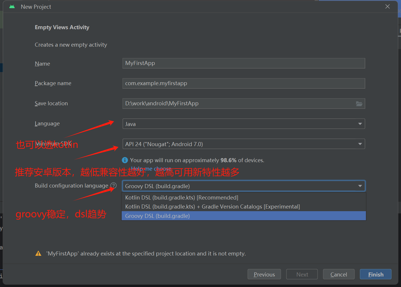 com.example.myfirstapp。Android Studio 会根据你的公司域名 (如果你在配置时填写了) 和应用名自动生成。你可以暂时使用默认的,但注意,包名是应用在 Google Play Store 上的唯一标识符,一旦发布不可更改。 - Save location (保存位置): 选择你希望项目文件保存的路径。
