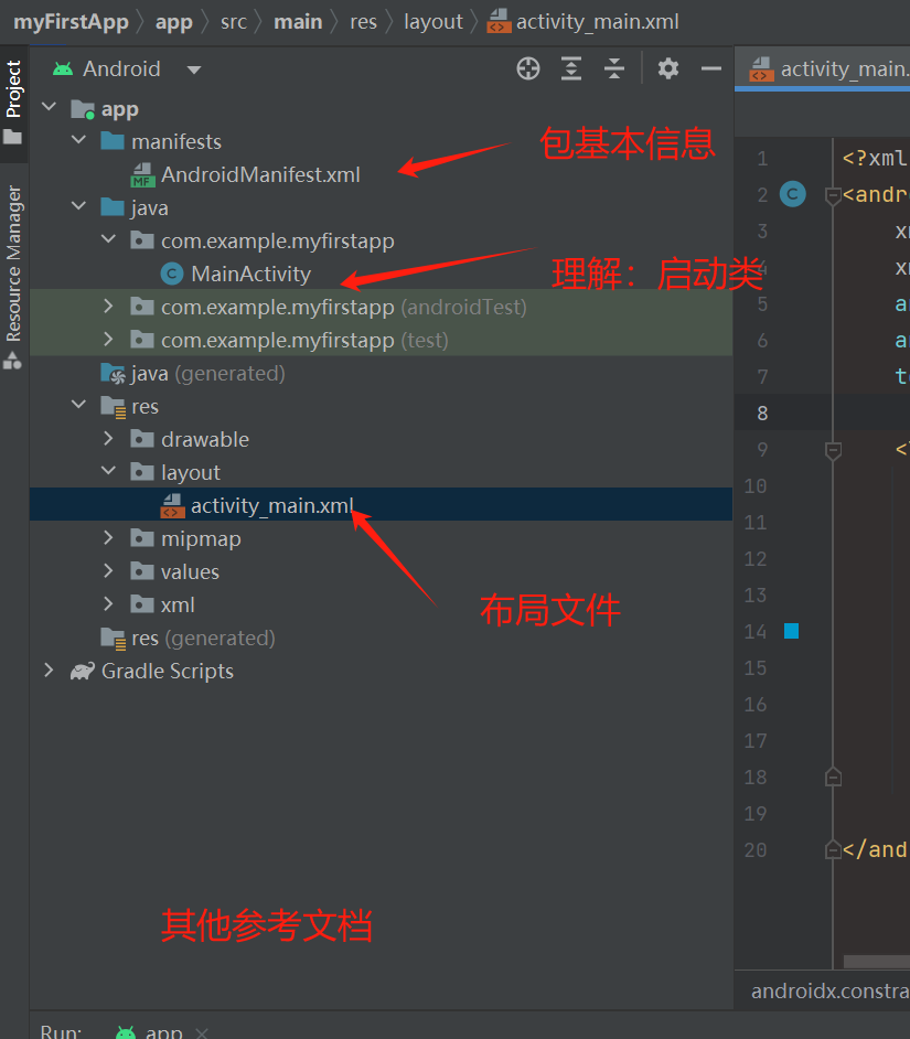 javacom.example.myfirstapp(或你设置的包名)MainActivity.java(或MainActivity.kt): 这是应用的主要活动 (Activity),可以理解为应用的一个屏幕。当你启动应用时,这个 Activity 会被加载。