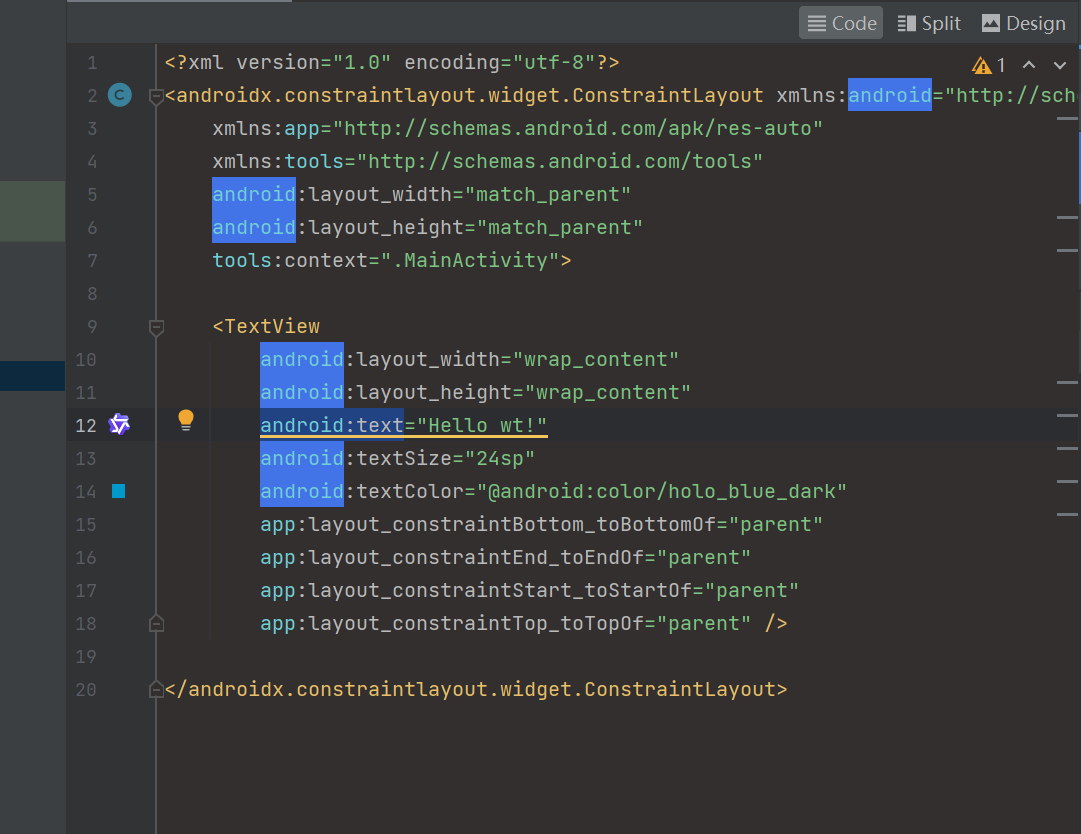<?xml version="1.0" encoding="utf-8"?> <androidx.constraintlayout.widget.ConstraintLayout xmlns:android="http://schemas.android.com/apk/res/android" xmlns:app="http://schemas.android.com/apk/res-auto" xmlns:tools="http://schemas.android.com/tools" android:layout_width="match_parent" android:layout_height="match_parent" tools:context=".MainActivity"> <TextView android:layout_width="wrap_content" android:layout_height="wrap_content" android:text="Hello World!" app:layout_constraintBottom_toBottomOf="parent" app:layout_constraintEnd_toEndOf="parent" app:layout_constraintStart_toStartOf="parent" app:layout_constraintTop_toTopOf="parent" /> </androidx.constraintlayout.widget.ConstraintLayout><TextView>就是一个用来显示文本的组件。android:text="Hello World!"定义了它显示的文本。