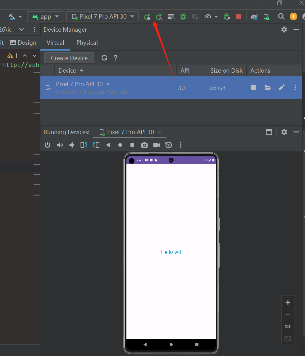 提示:这里教程都说要tools-avd manager,但是我这个是新版本的android studio,新版本已经去掉了,就直接在设备那边(右上角一个手机+安卓头像图标)然后点开下载一个手机虚拟设备通常几个G大小,最后运行你的app,点击播放按钮